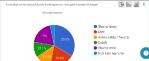 Të dhënat tregojnë se 45,7% e qytetarëve shprehen të pakënaqur, ndërsa rreth 38,6% e vlerësojnë pozitivisht qeverisjen aktuale, çka nënkupton polarizim të perceptimeve publike, por me dominim të pakënaqësisë ndaj performancës komunale.
