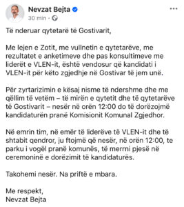 Me lejen e Zotit, me vullnetin e qytetarëve, me rezultatet e anketimeve dhe pas konsultimeve me liderët e VLEN-it, është vendosur që kandidati i VLEN-it për këto zgjedhje në Gostivar të jem unë.
