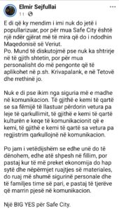 Në këtë debat publik, një zë i guximshëm dhe i sinqertë ka ardhur nga artisti Elmir Sejfullai, i cili pa ekuivoke e ka mbështetur Safe City, duke pranuar se ndoshta ky qëndrim nuk është popullor, por është i drejtë. Ai thekson se nuk ka asnjë arsye logjike të ikim nga siguria më e madhe në komunikacion, në një realitet ku të gjithë e dimë se sa shpesh vozitet pa leje, pa regjistrim dhe pa kulturë elementare rrugore.